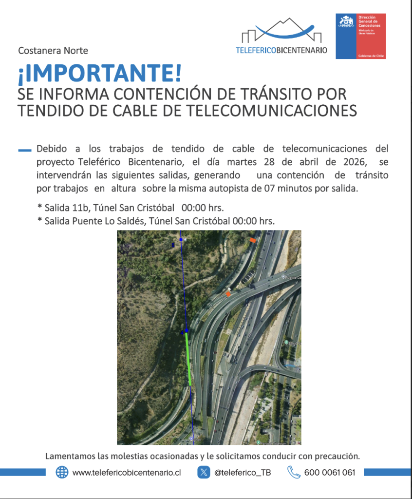 En el marco de las obras de construcción del Teleférico Bicentenario, se efectuará contención de tránsito de 7 minutos, sobre la misma autopista, el martes 28 de abril, interviniendo las siguientes salidas: